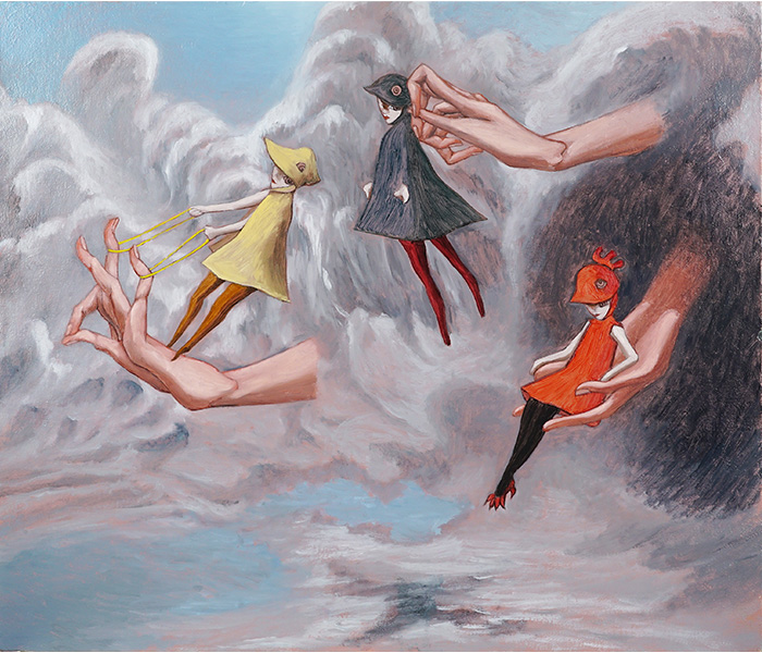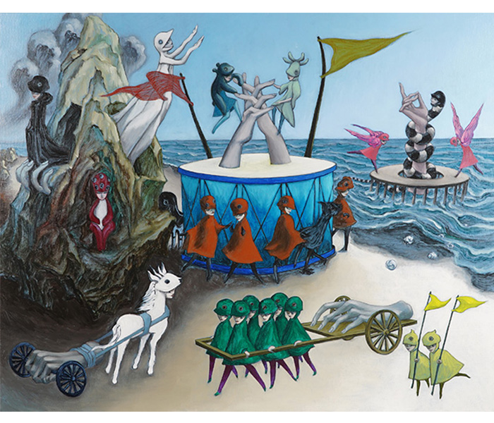 石川県で生まれ、10歳までの銅山跡での体験を神話化した独自の世界を描き続けている。2007年に無邪気な多頭のバンビ「頭いっぱいの鹿」、2019年に「福地の獣」の連作を発表。本展は過去展に続く不気味で可愛い異形たちの旅のお話「手首だけで動き回る=玉手」と「頭が一つで顔が二つの生き物=白虫」による終わりのない不思議な物語を描いた新作展。